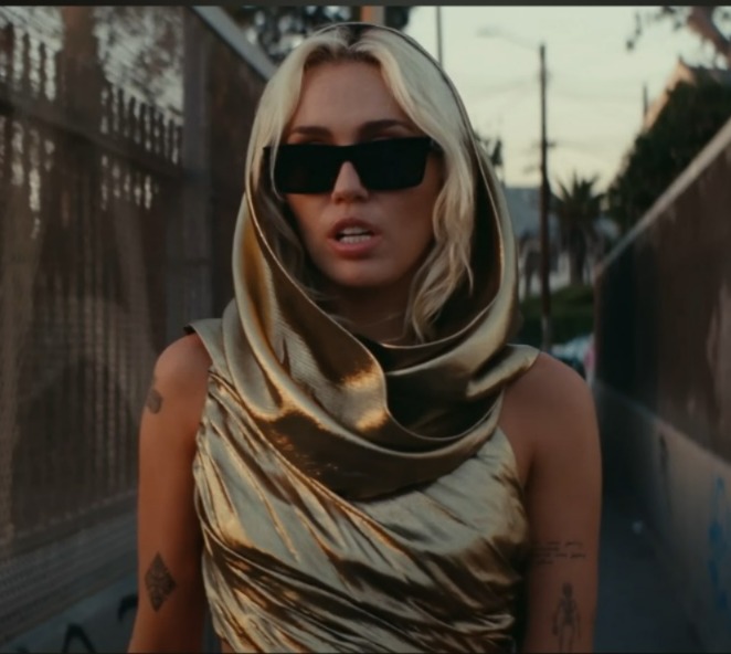 माइली ने इस शानदार गोल्डन लैमे हुड वाले पहनावे में पुराने हॉलीवुड के ग्लैमर को दर्शाया है, जो विंटेज लूक की झलक देता है। जिस तरह से मेटैलिक फैब्रिक का फ्लो और लाइट पर उसका रिफ्लेक्शन एक गॉडेस जैसा प्रभाव देता है। हुड उनके चेहरे को खूबसूरती से फ्रेम करता है और लुक को हाई-फैशन एडिटोरियल टच देता है।