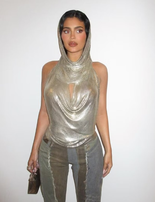 काइली ने चुनी एक स्लीक सिल्वर मेटैलिक हूडी, जिसमें फ्यूचरिस्टिक और फैशनेबल दोनों एलिमेंट्स नज़र आते हैं। इसका चैनमेल जैसा टेक्सचर विजुअल इंटरेस्ट जोड़ता है, और हुड उनके लुक को रहस्यमयी व बोल्ड बना देता है। यह लुक दिखाता है कि कैसे मेटैलिक्स साधारण पहनावे को भी रनवे-रेडी बना सकते हैं।