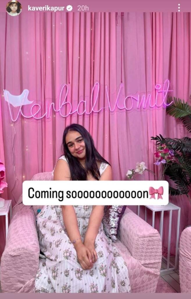 कावेरी कपूर ने अपने एक सोशल मीडिया पोस्ट से अपने फॉलोअर्स को अटकलों के भंवर में डाल दिया है। इस दिलचस्प पोस्ट में वह एक आकर्षक, गुलाबी स्टूडियो जैसे सेटअप में बैठी दिख रही हैं, जहाँ पीछे ‘वर्बल वॉमिट’ नाम की एक नीयॉन लाइट जल रही है।