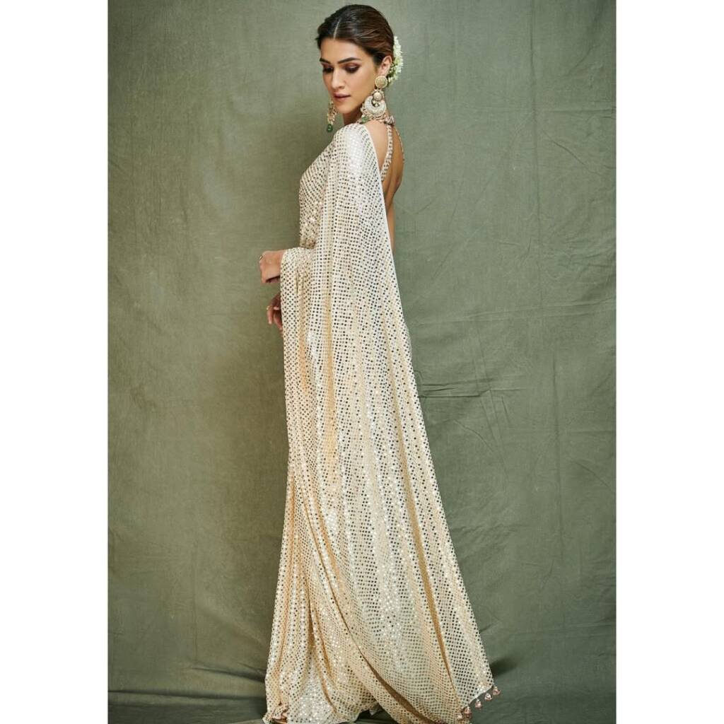 कृति सैनन ने आइवरी और सुनहरे रंग की सीक्विन वाली साड़ी में टाइमलेस ग्लैमर पेश किया, जिसमें पुरानी बॉलीवुड एलेगेंस का एहसास और आधुनिक अंदाज़ झलक रहा था। नाज़ुक शैम्पेन टोन वाले सीक्विन्स ने पूरे लुक को राजसी और रोमांटिक बना दिया। जबकि उनकी पारंपरिक ज्वेलरी और स्लिक हेयरस्टाइल ने उनके क्लासिक अंदाज़ को और निखार दिया।