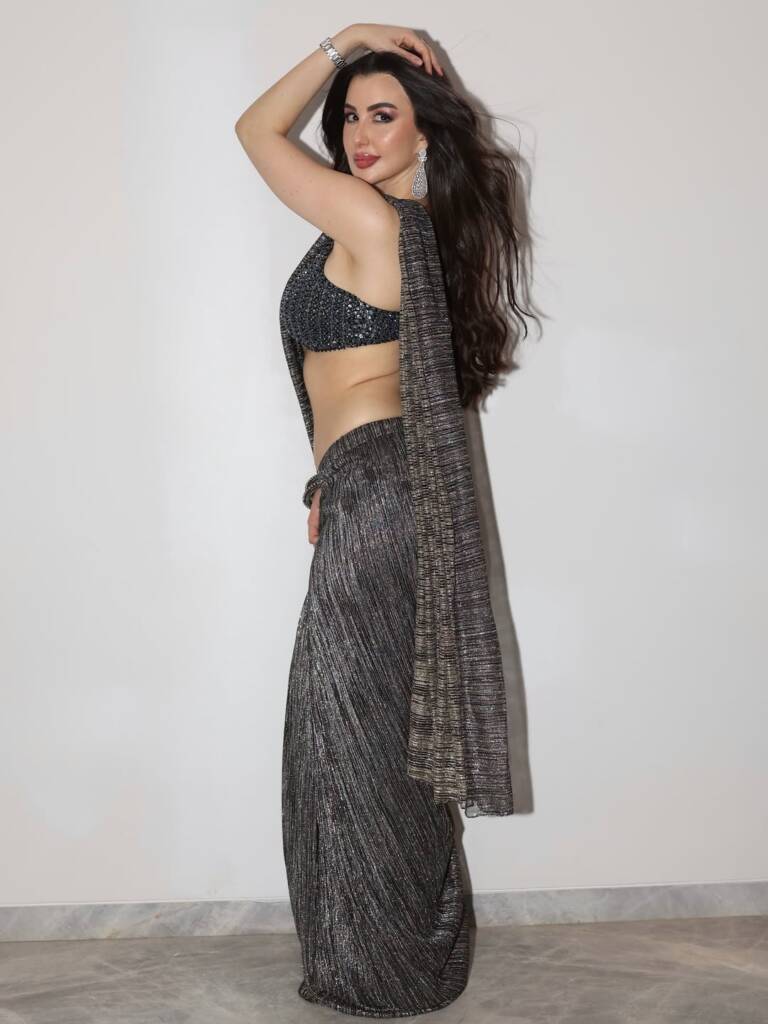 जॉर्जिया एंड्रियानी ने हज़ारों सीक्विन से सजी एक गहरे भूरे रंग की मेटैलिक साड़ी में शिमर के कॉन्सेप्ट को एक नई बुलंदी पर पहुँचाया। जिसने एक मंत्रमुग्ध कर देने वाला प्रभाव पैदा किया। उनके मोनोक्रोमैटिक लुक, वॉल्यूम वाले बाल और ग्लैमरस मेकअप ने उन्हें चलते-फिरते डिस्को बॉल में बदल दिया। यह लुक मैक्सिमम ड्रामा, मैक्सिमम शाइन, और हर कदम पर ध्यान आकर्षित करने के लिए बिल्कुल भी सही चुनाव है।